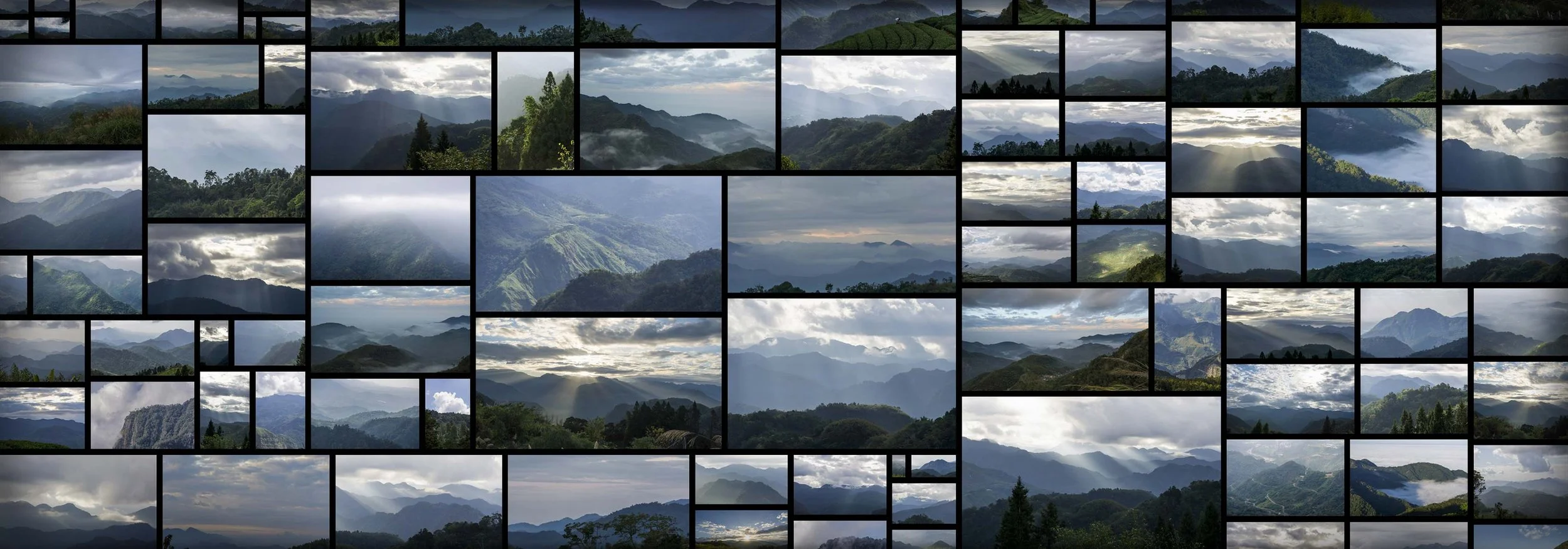 This set of scenic, mountainous landscapes features dramatic skies and sun rays, surrounded by a sea of mist. In the distant horizon mountains are layered amongst each other, creating a picturesque effect.